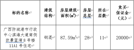 受委托,我公司对广西防城港市行政中心滨海大道南侧欧景蓝湾8号楼11A1号住宅进行公开拍卖,现将有关事宜公告如下: