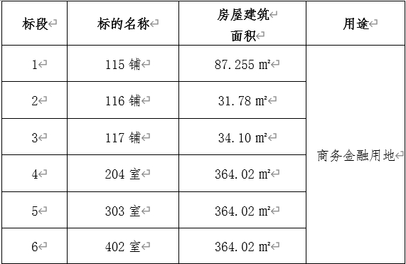1号标的:张掖市甘州区县府南街市城投写字楼商铺,位于甘州区南关学校东侧,一面临街,东临中国人寿保险,西临泰安小区东大门,南临中医胃肠医院,北临南街泰安社区。周边有甘州区南关学校、中国人寿保险公司等单位,各项基础设施及公共配套设施完备,18路城市公共交通车在此有上下车站点,交通通达度较好,出入条件便捷,人流量较大,商服业繁华程度较好。所在楼幢为钢混结构,东西朝向,总层数4层,拍卖标的位于地上1-4层,建筑面积合计1245.195㎡。房屋面积明细如下: